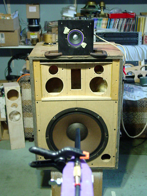 The test setup. The Sansui SP3500 look-alike is used to elevate the tweeter. The tape on the tweeter baffle is to hold the two mounting screws. The baffle is an original Wharfedale shipping baffle. |