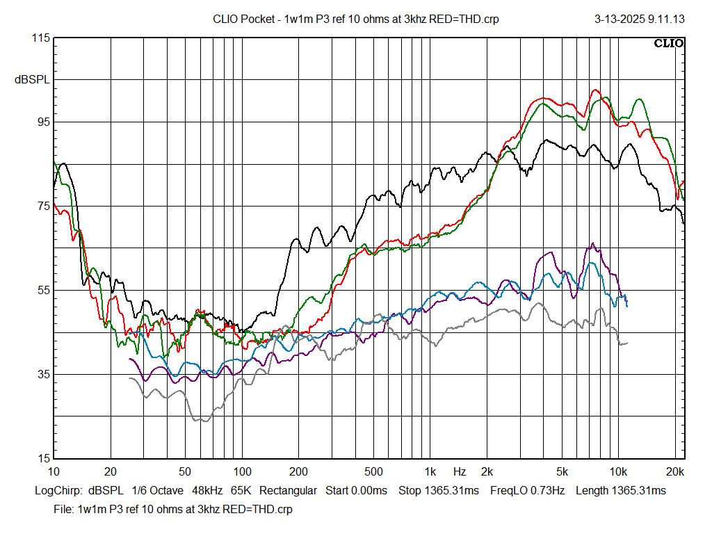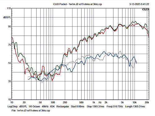 1w1m response curves of J1, red and J2, green. THD for J1 is green and that of J2 is light blue. The pair is remarkably identical.