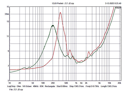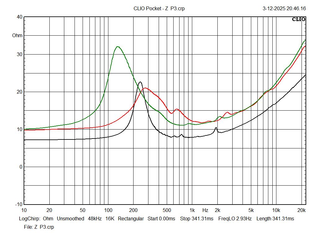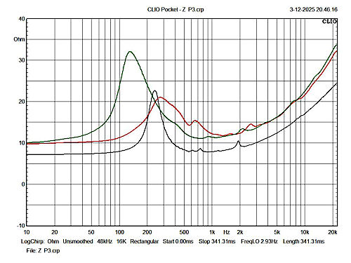 Impedance curves of P1, P2 and P3. The green curve of P2 parallels that of P1, red, above 1khz. These are the two used in my corner cabinets. Again, the different resonant peaks are likely due to the amount of glue used at the voice coil to cone junction, the amount used for the dust caps and more likely due to the friction of the inner foam disc used as the centering device for the voice coil. Those foam discs were hand cut before I came up with the idea of using two one inch washers bolted together. They are described on this page, photos 5 and 6.
