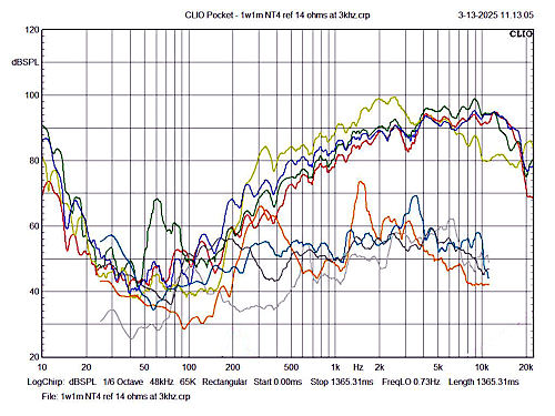 The NT1 and NT2 have the aluminum voice coils but the cones and dust caps are Waldom replacements, indicating they were restored in late 80's. Later, Waldom changed the cones to that shown in NT3, the one with the letter A on the magnet. This cone and annulus are one piece. This was not a good idea since the annulus will have resonances and induce reflections back into the cone. The result if this can be seen in the yellow and orange response curves in figure 2. The NT4 may have an original aluminum voice coil as the solder eyelets on the cone appear to be original. The purple annulus was added in July 29, 2014; it's marked on the back of the magnet. It is 15W; the dcr is 10.2W; the others are all under 6W dcr. The foam annuli on NT1 and NT2 were probably acquired from a dry cleaner when they used foam on metal hangars. Briggs also used such foam in the early years.