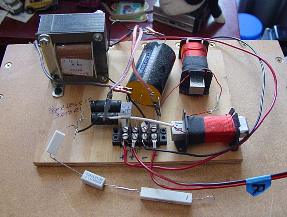 The crossover is two-way, second order, obviously. This crossover was originally designed for use with a system comprising a Peerless 831857, a 12 inch unit coupled with the Satori MR16P-8 with a papyrus cone. The crossover frequency is 200hz. As luck would have it, the nominal impedance of the Peerless and the BassLite at 200hz are the same, so another crossover wasn't needed. The resistors were used to attenuate the more efficient Satori when used with the Peertless. They were alligator clipped into the circuit to form a fixed L-pad and are not used here. As can be seen in the photo, I use a lot of wires with alligator clips to temporarily set up a system and I will admit, it does have its drawbacks.