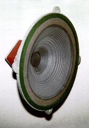 The woofer. Yes, that device responsible for moving dishes. It also has an alnico magnet, 2 inch voice coil and an excursion of about 3/4 inch; 3/8 inch in either direction. The cone, made of treated paper, is extremely rigid. The annulus is foam, not original and the frame is cast. Although designated as a 15 inch, the diaphragm area is just slightly larger than a 12 inch. The 15 inch was measured across the bolt mounting tabs. And, of course, being made in England, all three drivers had a nominal impedance of 15 ohms. | ![]() |