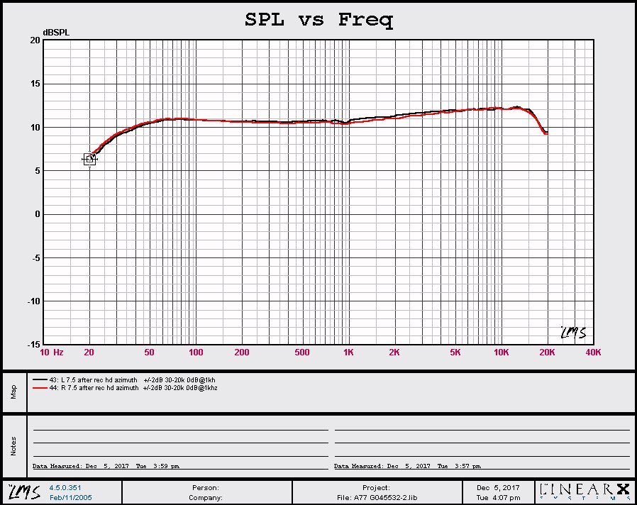 SPEC @ 7.5 ips = +2 / -3 dB 30hz - 20khz (actual -2 at 30hz, +2 at 12khz and -2 at 20khz, or +/-2dB) and +/- 1.5 dB 50hz - 15khz (actual = -0.5 at 50hz, +1.2 at 12khz and +1 at 20khz, within +/-1.5dB) I will admit that the above sounds like nit-picking and that the curve doesn't look that flat but the point is, it's in spec. Keep in mind these machines are from the sixties and technology then wasn't what it is today, especially not for a home audio recorder. |