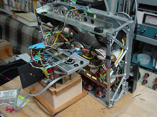 The center unit in the lower compartment is a Tektronix AA501 distortion analyser with a built in AC voltmeter. This unit was also purchased in 1984 with the scope as was the FG-502 function generator (left) On the right is a DM-501 purchased years later. It was repaired (flaky switches and old caps) in March, 2014 by Norway Labs at a cost of $347 including shipping both ways. It's certified to meet original specs which are: 0.05% on DCV; 0.2% DCA; 0.6% ACV (40hz - 10khz) and 1% between 10hz - 40hz and 10khz - 20khz); 0.6% on ACA, 20hz - 10khz). Ohmmeter is 0.15%. The DM-501 is used to check the accuracies of the other meters. The AA-501 specs at 2% (20hz - 20khz) and still meets that. The Flukes, when new had the best accuracies of 0.03% DCV and 1% ACV (20hz-20khz) While they don't meet that now, they do meet the specs of the DM-501. As I mentioned earlier, the name says it all. Those guys are about 45 years old. |