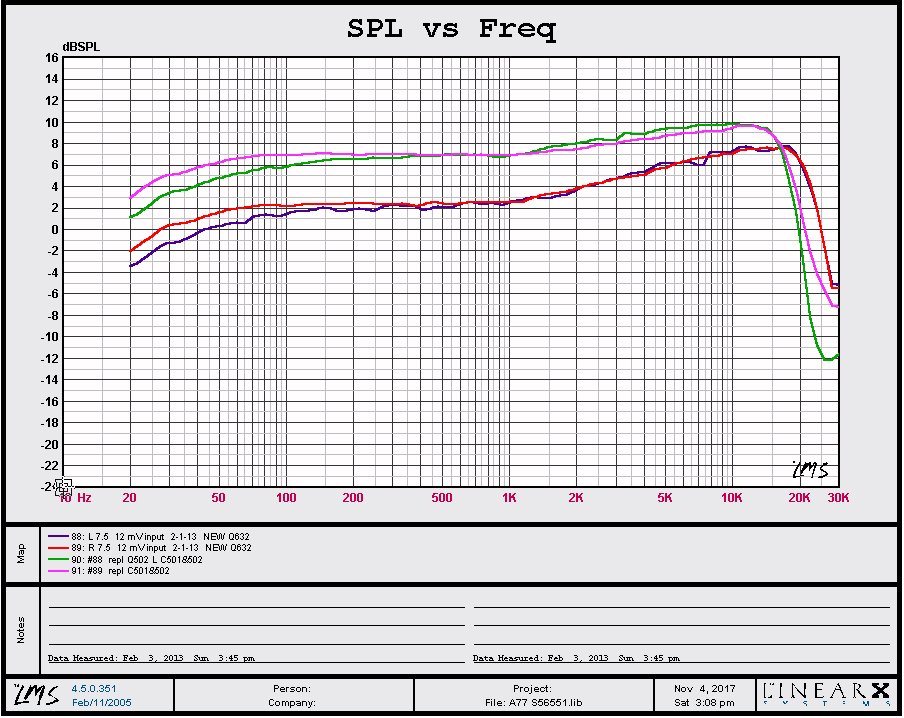 ftp://ftp.studer.ch/Public/Products/Revox/Revox_A77/TechInfo/Revox_A77_Mono_Diagr.pdf The values of some of those resistors that are changed can be slightly changed from that given to adjust the response curve. That's how these curves were obtained to be flat within 2dB, a lot better than specification, +2 to -3 @ 7.5 ips, 30 to 20k This machine, at 7.5 ips is flat within 1.5dB from 20 to 20k and at 3.75 ips is flat within 1.0dB from 30 to 16k. So, how much better will this one sound over one just within spec? Probably not detectable. The main and only reason for doing it was to find out if I could. |