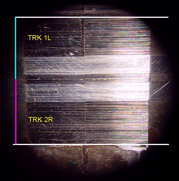 This shows the difference between a quarter track, left and a half track, right. The colored markings are in proportion to 1/4 and 1/h the tape width, that being 1/4 inch. The numbers on the left refer to the tracks on the tape, track 1 being on top. The dark bands do the recording or playback.. S1T1L means side 1, track 1, left. When the tape is flipped to side 2, it becomes side 2, track 4, left. When flipped, track 4 and track 2 swap positions with 1 and 3, respectively. It can be seen that for a quarter inch wide tape, each band labeled 1, 2, 3 and 4 is 1/.16th inch wide but the actual recorded width is smaller. This prevents adjacent tracks from being heard on the tracks being played. I think it's called cross-talk. The quarter track head shown is a new one. The head on the right is a half track. Again, the blue and red marks are 1/8th inch wide for a quarter inch wide tape and the recorded bands are smaller for the same reason stated previously. |