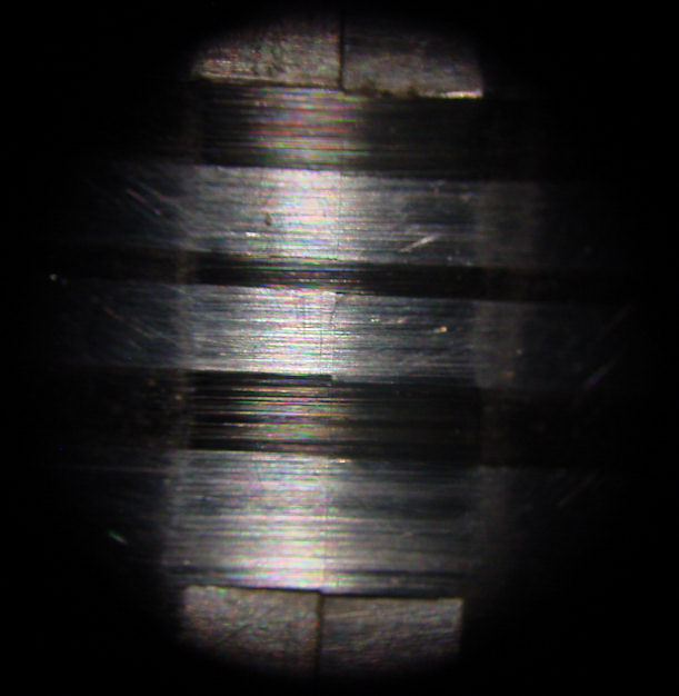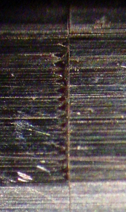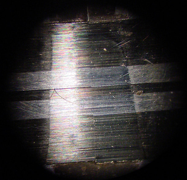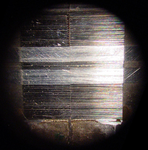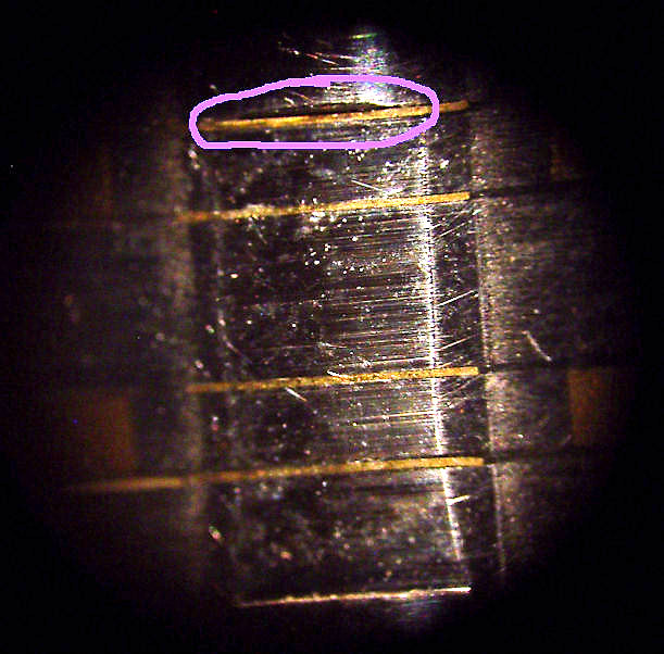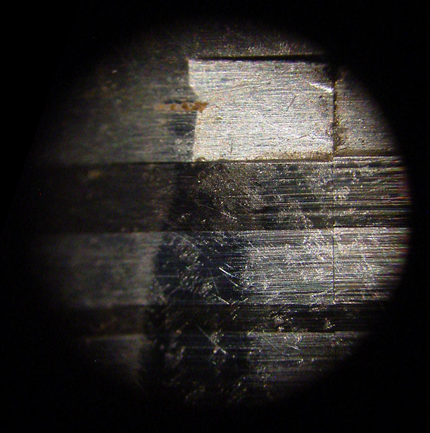 The casing above and below the part of the head that contacts the tape is machined below the surface of the head. This serves two purposes. 1. It may serve as a guide to when the head needs replacement or relapping, when the wear width is equal to the width of this flat surface. (left photo) 2. It prevents the edges of the tape from becoming damaged as the head wears. When this happens, a channel in the head surface will be the width of the tape and due to variations in tape width and tracking errors however small, the edges of this channel will damage the tape. The next photo shows this phenomenon.