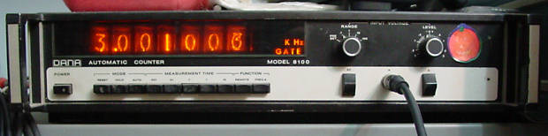 The digits shown here are directly from a genny and are to show the nixie display. It can sample at 0.001 sec to 10 sec. It is set here at 0.1 sec. It will display 8 digits in 1 sec and 10 sec sampling rates. The last digit appears blurred due to its changing 10 times a second; the genny and the counter haven't warmed up enough. |