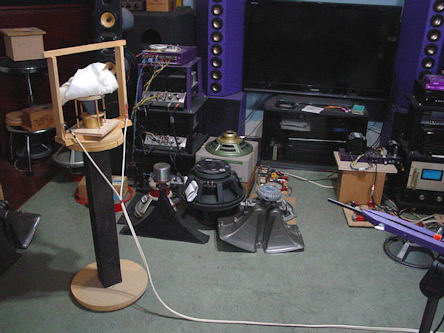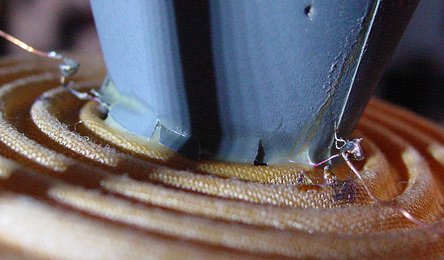PHOTO 6 It may look crude but it doesn't buzz at any frequency above 800hz when driven with about 8 watts, after which a buzz was detected and stopped by lightly touching the wires close to the cone apex. Further operation was ceased below 800hz to avoid breaking a wire. Subsequent response tests were done with a 1.2khz second order high pass filter, seen in photo 11