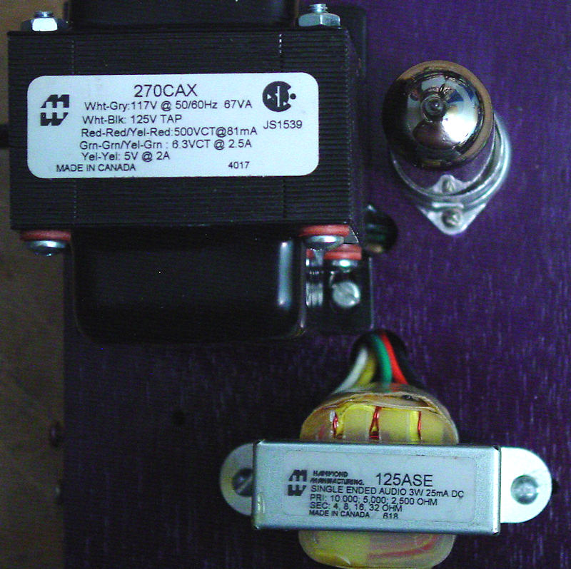 The data on the power transformer (top) and the output transformer (bottom) A much better high fidelity transformer is available but the $148 price tag can't be justified. Two would be required for stereo. |