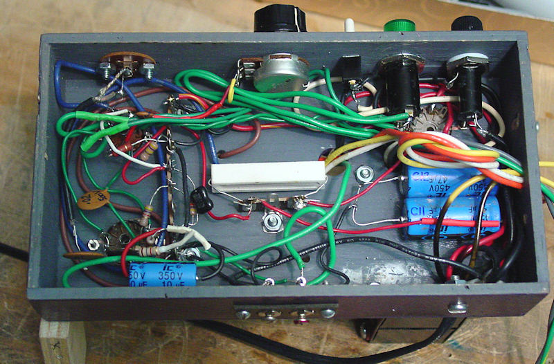 The little fella completed. The wood chassis didn't present a hum problem. Had it done so, a metal chassis would have been used and a 3 prong AC line used, grounding the chassis. The circuit ground would have been floated above chassis ground. This would also have grounded the metal tube sockets thus allowing shields to be used. Since the original recorder used a two prong AC line, the metal chassis was considered unnecessary. |