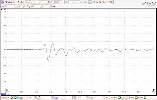 Papyrus has lighter cone by 3g; better compliance; lower mechanical resistance (spider & annulus); lower cone mass; top plate 5mm vc=11.2mm; less force factor BL by 0.5T In view of the above noted parameters, the following results almost seem counterintuitive but consider the following. First, the impulse signal is one half cycle at the specified frequency and at a level of about 20 watts driving the cone a few mm. This will drive the cone in one direction like a plucked guitar string where the force applied to the string pulls it in one direction and it is released to oscillate. The initial pull (pluck) is the longest, after which each succeeding oscillation is less than the previous, a damped oscillation. The half cycle applied to the voice coil behaves the same way as can be seen by the initial vertical peak in each spectrograph with exception of the first, at 400hz. It is possible the time base on the scope wasn't set correctly. This method was used with a PICO Scope prior to acquisition of the CLIO, which does this easier and most likely, more accurately than my manual method. The decay can be best seen from 2000hz and above; the irregular decaying oscillations at 500hz is not understood - yet. The last three show a regular decay with more oscillations as well as a higher initial peak in the wood cone. This is attributed to the inverse or opposite of the above parameters despite the higher BL force if the wood cone speaker. That higher mass, once set into motion, is harder to stop due to a higher momentum. It's similar to a moving ship; it hard to set into motion and equally hard to stop. A stronger power system will help as it does with the higher BL force of the wood cone motor. In the case of the papyrus vs the wood, the lower cone mass and better compliance of the papyrus cone seem to be the major contributing factors for the faster decay of the impulse. Despite all the above, none of that will tell anyone how it sounds or better yet, if one likes that which one hears. The only way to make that determination is to listen to the music. Many focus too much attention listening to the system and miss the music.