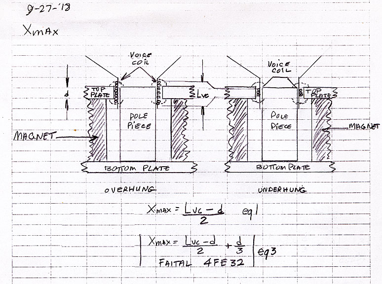 However, the magnetic field doesn't stop at the top of the gap; it follows a dome shape slightly above the gap as shown by the dotted lines above and below the gaps. This seems to be what has been taken into account by Faital in Italy (eq. 3) By that eq., is appears that the useful field above the gap is about one third the thickness of the top plate. I would suspect that non linear distortion is taken into account as this will rise as the coil exits the field. This brings up a speaker spec called the BL product, which is the product of the field strength in Teslas (T) and the length (L) of the wire in the field. It's stated as Tesla/meters (Tm). Actually, the force (F) applied to the coil is BLI, where I is the current. It's synonymous with Newton's law that states F=ma, where m is the mass and a is the acceleration. From that, we get F=ma=Bli and therefore, the useful relationship between ma and Bli. Engineers have a heyday with such mathematical relationships as did I but these relationships say nothing about how the speaker sounds1.