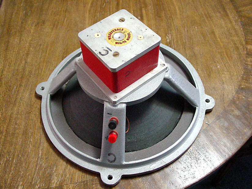 A W15FS (prpple) with a new cone & coil assembly which was one of four purchased directly from Wharfedale in 1972. The foam is a better type than the original as it lasted without deterioration since '72. This unit, below, along with its twin, are currently in use in a pair of corner enclosures.