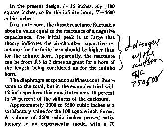 | Before long, most of the crowd dissipated and there was but a few of us left. That was when he took notice of my presence far off in the distance. I think it was the library I had with me and not myself that aroused his curiosity. He invited me over and after the usual self introduction, I began asking him some rather highly technical questions on the theory of horns. I made reference to a paper he published in 1941 in which I found something that was in contradiction with later papers published by himself and others. He kinda chuckled and took his pen from his pocket and leaned over to write a comment in the margin next to the statement in question, which he enclosed in parentheses. He wrote, "I disagree with the author." and initialed it, PWK and dated it 750508. | ![]() |