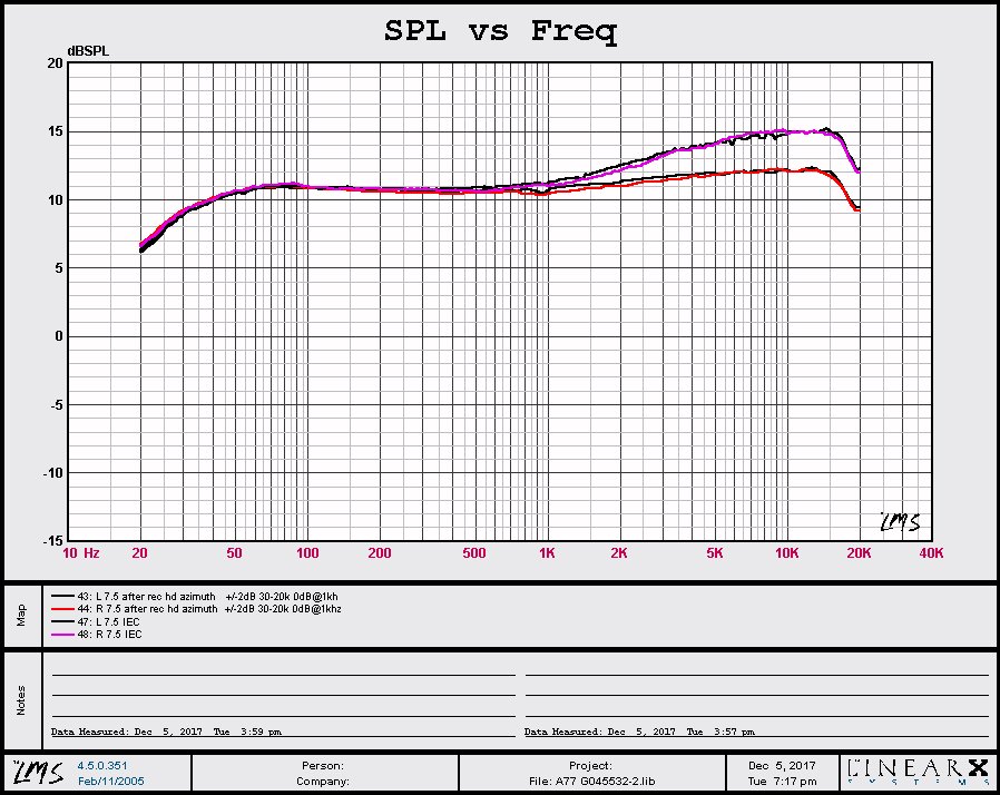 SPEC @ 7.5 ips = +2 / -3 dB 30hz - 20khz (actual -2 at 30hz, +2 at 12khz and -2 at 20khz, or +/-2dB) and +/- 1.5 dB 50hz - 15khz (actual = -0.5 at 50hz, +1.2 at 12khz and +1 at 20khz, within +/-1.5dB) I will admit that the above sounds like nit-picking and that the curve doesn't look that flat but the point is, it's in spec. Keep in mind these machines are from the sixties and technology then wasn't what it is today, especially not for a home audio recorder. |