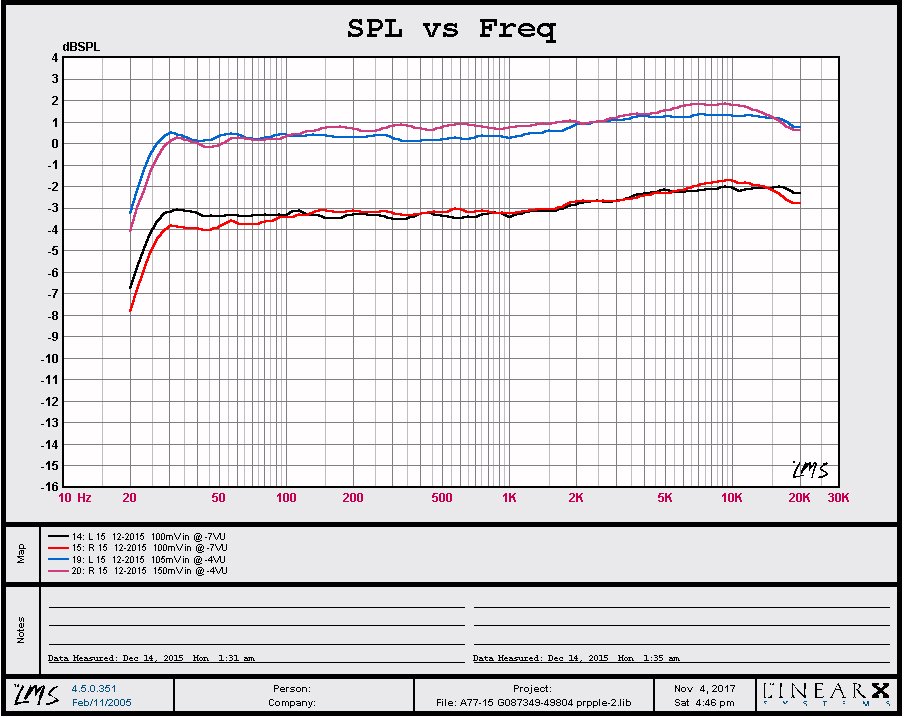 Just for schitts 'n giggles, several were removed from the boards and checked not only with a capacitance and ESR meter but also with a DC power supply at the rated voltage of the capacitor and many leaked with the full rated voltage applied. Meters use a very low voltage to check capacitors but they should be checked with at least the voltage applied in the circuit or better yet, their full rated voltage. This is especially true for electrolytics used as DC supply filters. The method used there is to charge the cap to its rated voltage with a DC voltmeter across the capacitor. Once charged, the DC supply is removed and if the capacitor is good, it will hold its voltage. If it falls more than a few percent per second, it's probably leaking internally. A good reference is to do this with a known good capacitor and compare the old one against that. Despite that large electrolytics have a pressure relief plug, they can spit their innards, so wear goggles and stay a few feet away. I've never seen one explode even when taken to 30% above their rating but schitt happens. They do have a surge voltage rating which is usually about 30% above their operating voltage. So, the tantalums were all replaced from this point on. I know they can be considerably more expensive than their electrolytic counterparts but having to open up a machine to troubleshoot a problem makes that additional expense worth while. Regarding the curves below. After the speed problem was resolved, a few minor checks were performed, one including checking the bias and equalization settings. The original pots were flakier than in 2011, so they were replaced. Original physical size pots weren't available so smaller sealed pots of higher quality were used. These had to have their terminals lengthened by 1/4" to fit the board. AWG20 wire was used to provide stability as thinner wire tended to let the pot move inward when applying slight pressure from the adjusting screwdriver. These pots were very smooth when checked with an analogue ohmmeter over the complete arc of rotation. The curves below are the result. While the curves rise with frequency, keep in mind that the scale is 1dB/div. Referencing from 1khz, the response is +/- 1.5 dB from 30hz to 20khz. The overall deviation is within 3dB, which is 2dB less than spec for 7.5 ips machine. The result in this graph might be expected of a 15 ips machine.