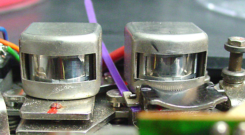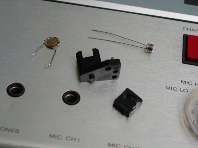 The EOT (end of tape) photocell assembly disassembled. The old and a new (not an NSL-4522) CdS sensor are shown. This was my first CdS sensor and it was a tight squeeze in the assembly but it worked. These CdS cells won't work with an LED.