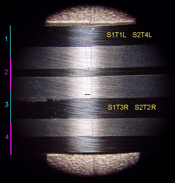 This shows the difference between a quarter track, left and a half track, right. The colored markings are in proportion to 1/4 and 1/h the tape width, that being 1/4 inch. The numbers on the left refer to the tracks on the tape, track 1 being on top. The dark bands do the recording or playback.. S1T1L means side 1, track 1, left. When the tape is flipped to side 2, it becomes side 2, track 4, left. When flipped, track 4 and track 2 swap positions with 1 and 3, respectively. It can be seen that for a quarter inch wide tape, each band labeled 1, 2, 3 and 4 is 1/.16th inch wide but the actual recorded width is smaller. This prevents adjacent tracks from being heard on the tracks being played. I think it's called cross-talk. The quarter track head shown is a new one. The head on the right is a half track. Again, the blue and red marks are 1/8th inch wide for a quarter inch wide tape and the recorded bands are smaller for the same reason stated previously. |