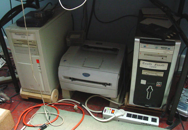 The one on the right is a WIN XP machine that I used to use on the net. It was taken from my stash for the sole purpose of running the PICO scope (seen on top). It's a USB powered scope about the size of a deck of cards. The scope function is seldom used unless I need to save and print a screen, which is far better than trying to take a piccy of the 465 scope. It also has digital storage capability great for catching pulses but the main reason I bought it is because it has a spectrum analyser. The cost. $400. Incredible device. The little fella in the center is a Brother HL-2040 laser printer used only for text files. Anything requiring color is saved to a thumb drive and printed on a Canon color ink-jet if required. Most of the color files are used in web pages.