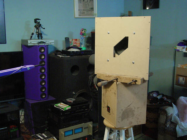 This pyramid is mounted on the inside of the rear of the box. Response sweeps were run with and without the pyramid and padding. First, neither had much effect on the response and there never was a dip at 1khz observed with or without the pyramid and padding. There is, however, a wide rise in response between 2400hz and 4200hz but that's blamed on the speaker, not the cabinet.