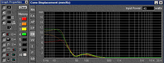 Figure 4 Diaphragm excursion vs frequency with 40 watts input. All of these designs will stay within 5mm excursion to 35hz with 40 watts to the woofer.