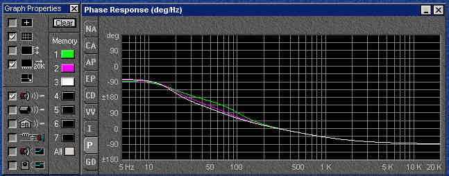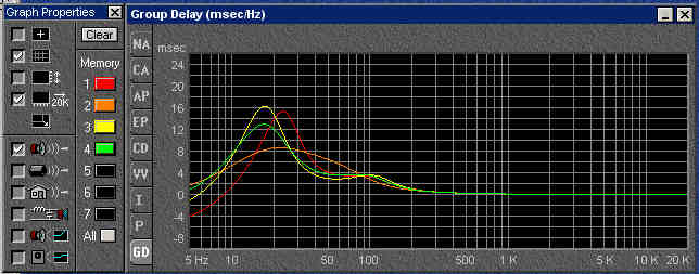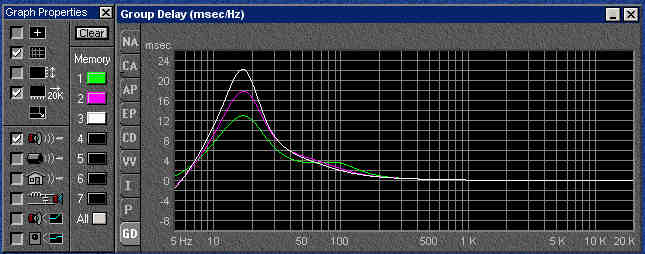 Figure 6 Ahh, group delay, which is phase response expressed in time. For one thing, the more linear the graph, the better the transient response. At low frequencies, this may be perceived as a tighter bass. It will usually go unnoticed unless the delay is long or the listener doesn't care. However, if the speaker system is being used with video, this can become quite noticeable. With a camera zoomed close to a bass guitarist, the note will be heard after the string is plucked. This I've seen to be quite noticeable with classical music and the camera zoomed to the kettle drums. The drumstick hits the drum and the note is heard when the drumstick is elevated back up. This is quite noticeable with a single strike to the drum. A glass dropped to the floor will shatter before the sound is heard. With a person talking in a low register, the lips will appear out of sync with the sound.