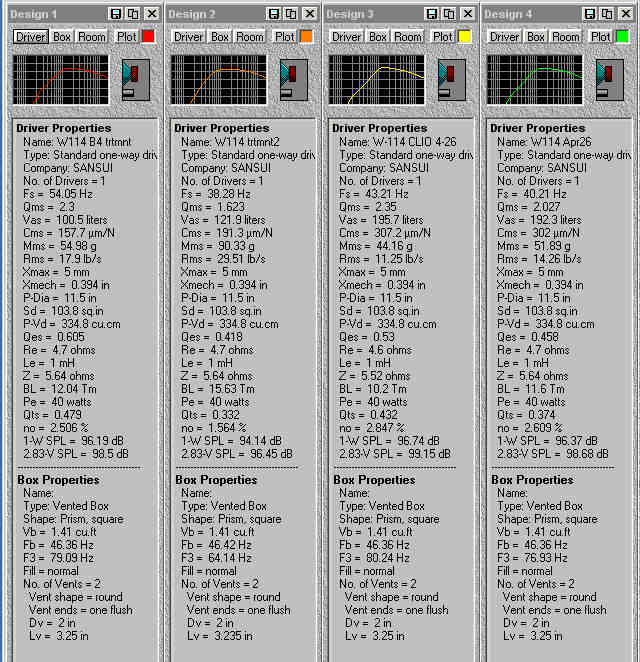 Performance Simulations Using Bass Box Pro, ver6 The following is some data from BBP. Fig.2 shows the TS parameters derived during three annulus washes using pure acetone. For clarification, they are as follows. RED: prior to treatment, fs was 54hz. This was subsequently brought down to 43hz(yellow), then 40hz(blue) and still lower to 38hz(orange). After several hours, the 38hz settled in around 41hz due to evaporation of the acetone. It should be noted that the sequence seen in fig 2 has nothing to do with the washing sequence; it is the result of picking the data from BBP files. The washing sequence can be determined by the fs parameter. Red, yellow, green orange. From the data shown, it's a good possibility that the original data is that of design 2, orange. This is because when BBP calculated vent dimensions, it resulted in the same vent dimensions as the SP3500. The vent dimensions in the other three designs were manually inserted. It also makes sense that the lowest possible fs be desirable due to the small enclosure volume. Design 4(blue) is considered to be the expected result after restoration. This is due to the annulus drying after washing and becoming stiffer after about a day and holding for several days later. After playing for about an hour, fs was found to lower and rise after sitting idle for a few hours. Based on that, the simulations of designs 2 and 4 are what are considered to be what is the norm. Actually, looking at fig.3, the difference seems negligible. The orange does do better at lower frequencies below 100hz and the bump between 100hz and 300hz is smoothed. It should be stated that the audible difference with music is much more pronounced. The extended range below 100hz is more noticeable than the smoothness between 100hz and 300hz, although the latter of these may be preferred with some music.