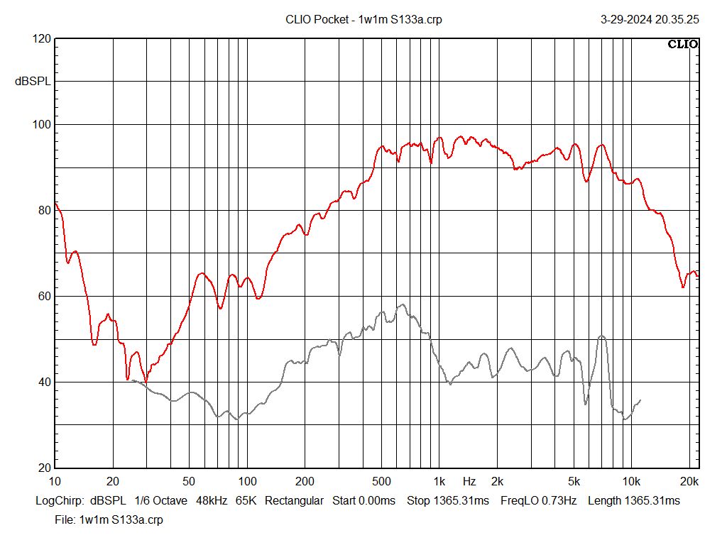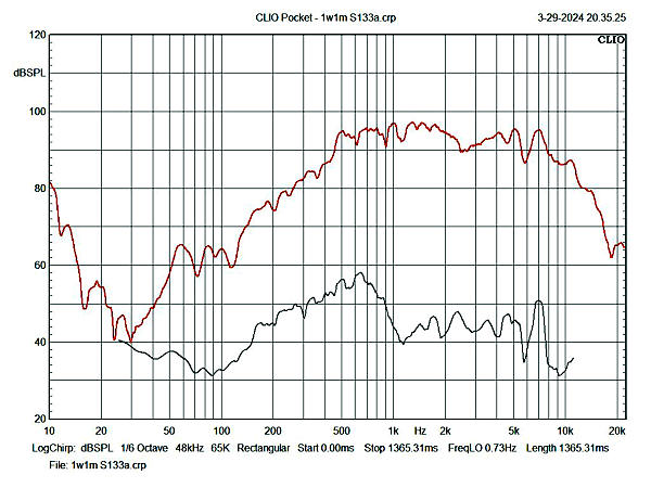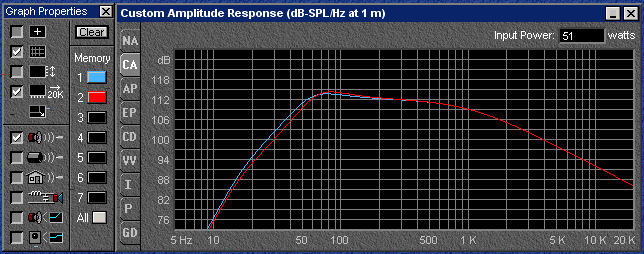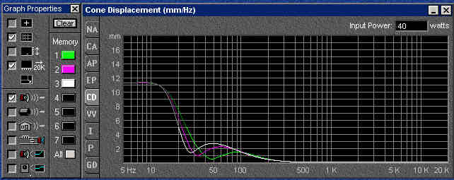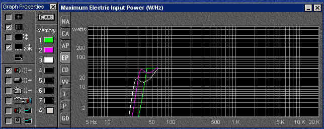 As can be seen in the pink trace, maximum power handling is compromised with an enclosure of 2.9ft^3 to 30 watts in the bass region around 50hz (caveat 1). This could be a problem with rock music. It gets worse with an enclosure volume of 4ft^3, (white trace). This may be one reason why Sansui used such a small enclosure (blue trace). Another possible reason may have been to keep the enclosure small enough to pass the WAF (Wife Acceptance Factor).