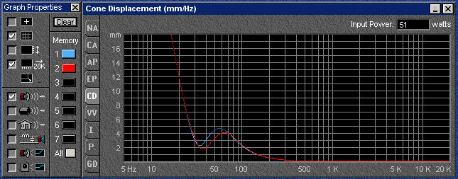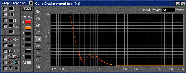 The other caveat is diaphragm excursion. As can be seen by the blue trace, excursion is highly controlled. As the enclosure volume increases, more excursion is allowed but less power is required to obtain it as is seen in fig.12. Admittedly, the bass output will increase in volume due to larger diaphragm excursion but this increases the risk of damage. Common sense can keep one out of trouble.