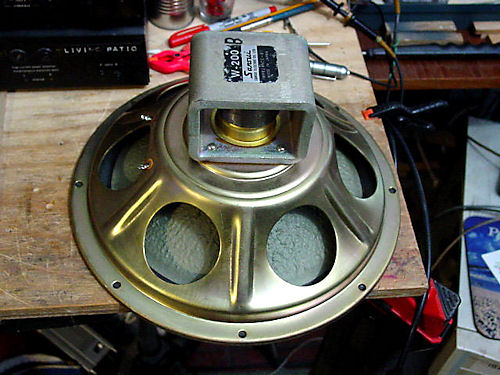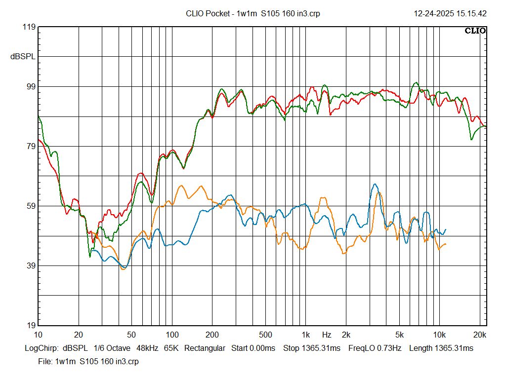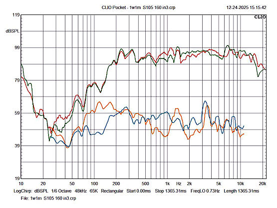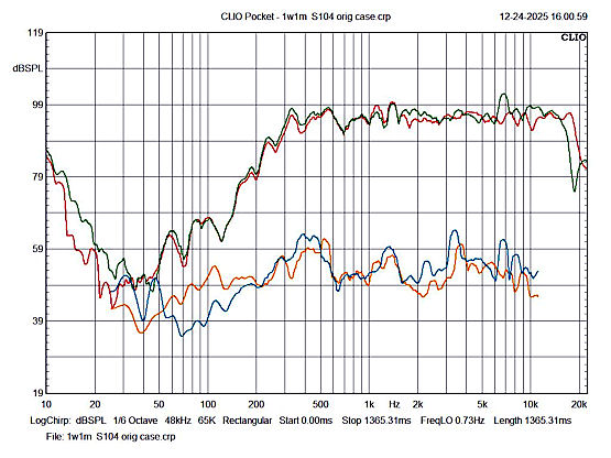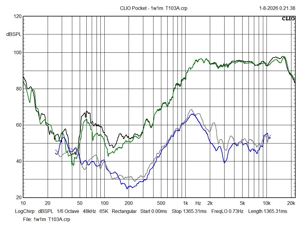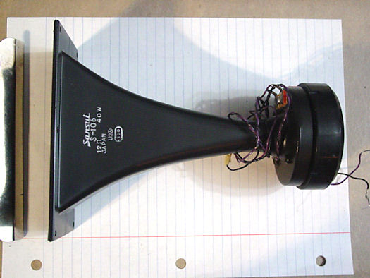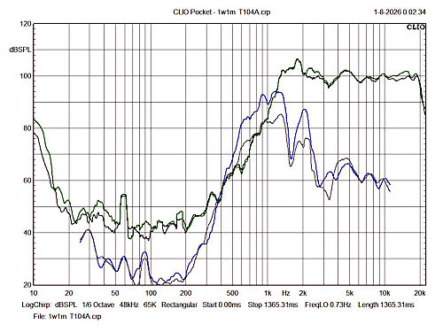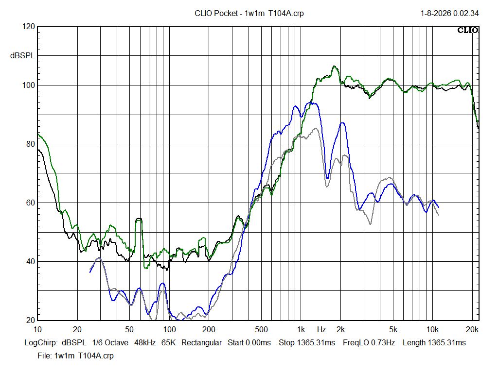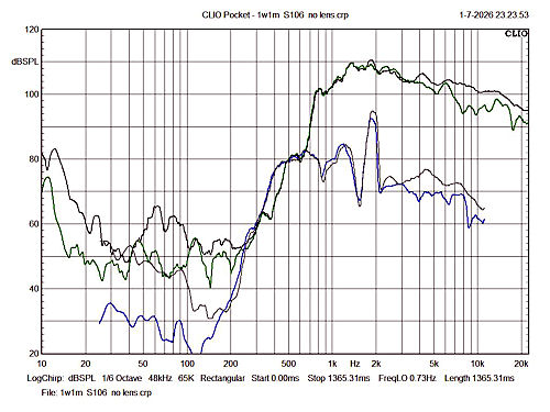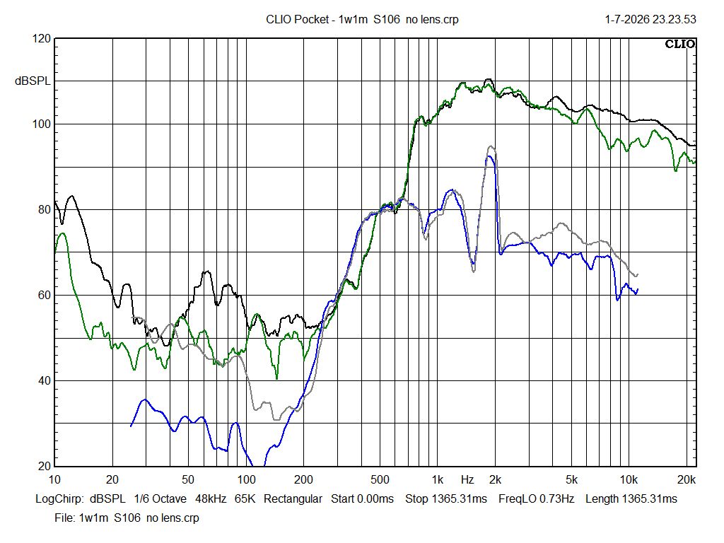 HORNS - Midrange and Tweeters The S-106 and no plastic horn here; it's aluminum. It doesn't ring when bolted to a baffle. 1w1m S-106 BLACK-no lens GREY-THD GREEN-lens BLUE-THD THD somewhat high around 3.2% above 2khz. The green and blue curves are the lower curves in each pair.